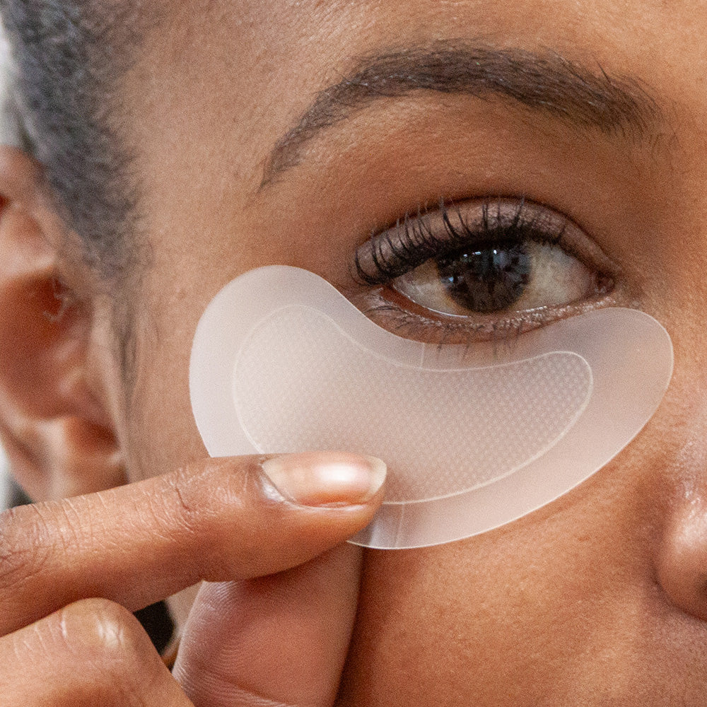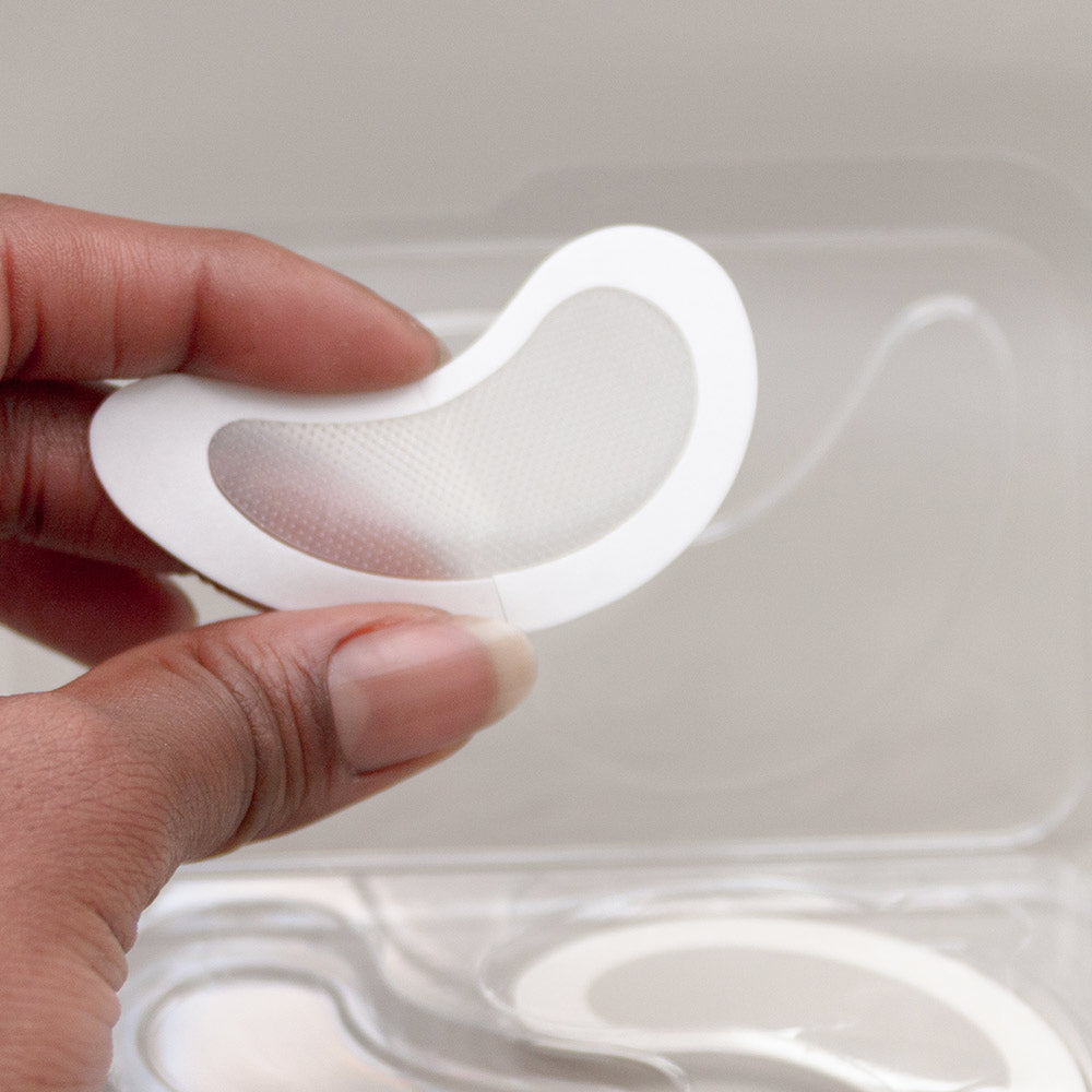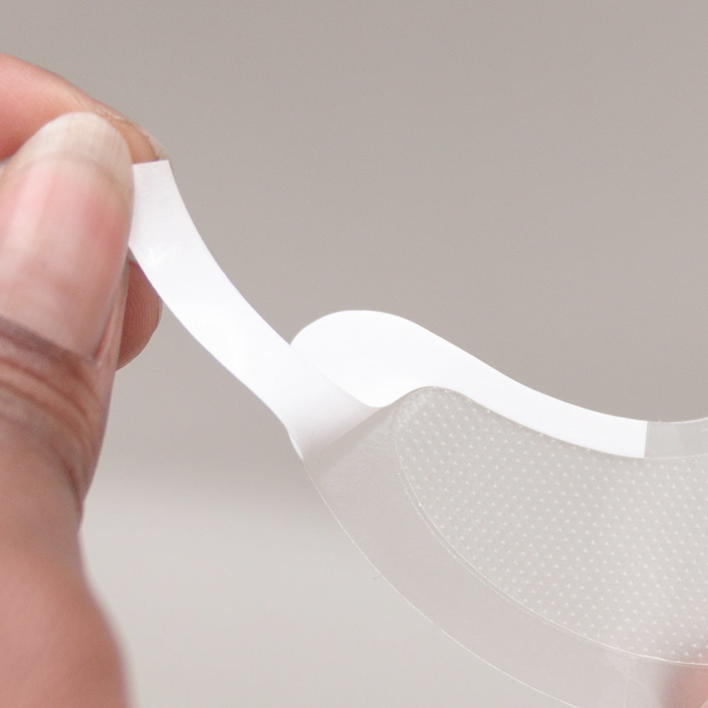 - Remove the white protective film from the patch and apply it on the under-eye area with the adhesive side facing down. Make sure not too touch the needles as you apply it.